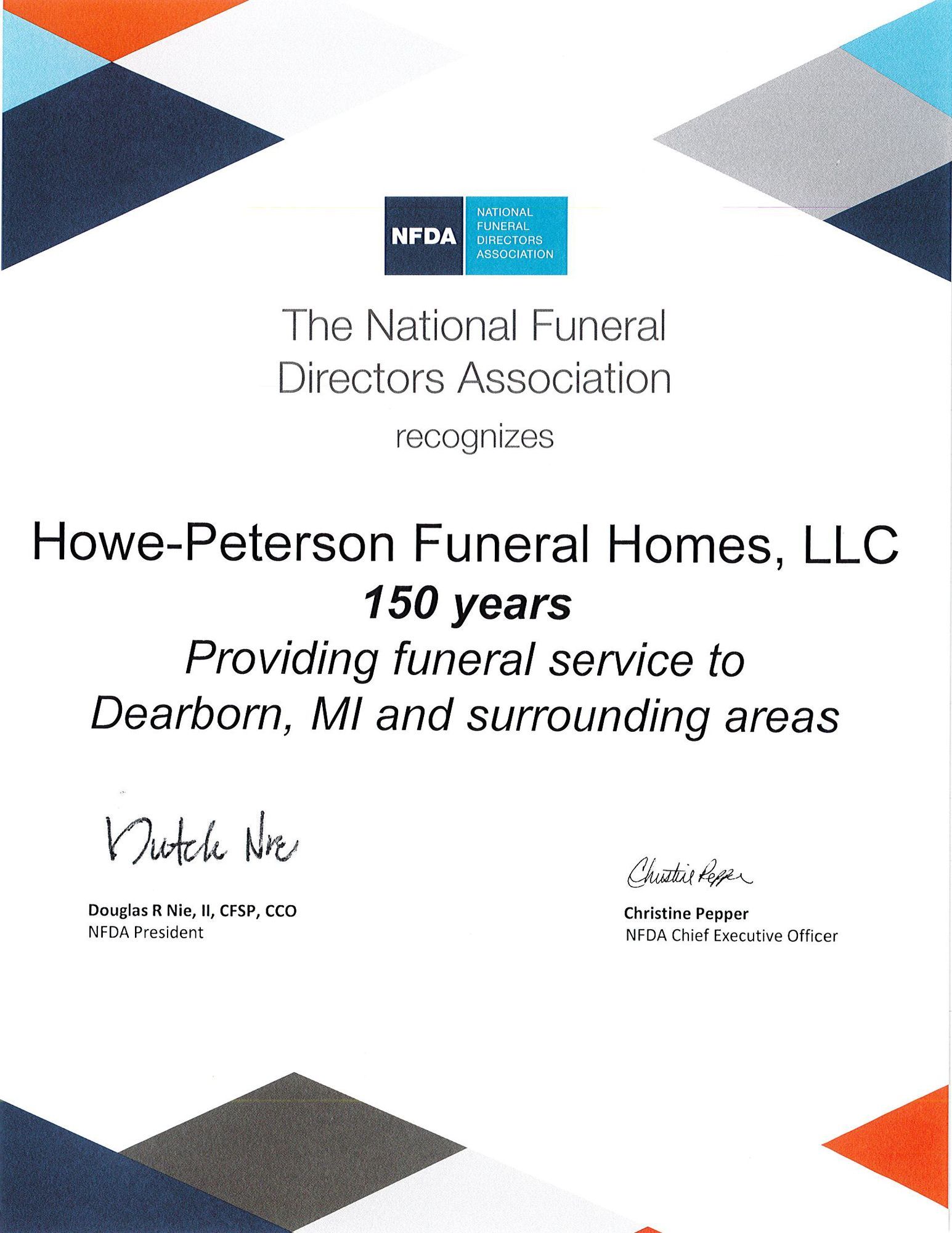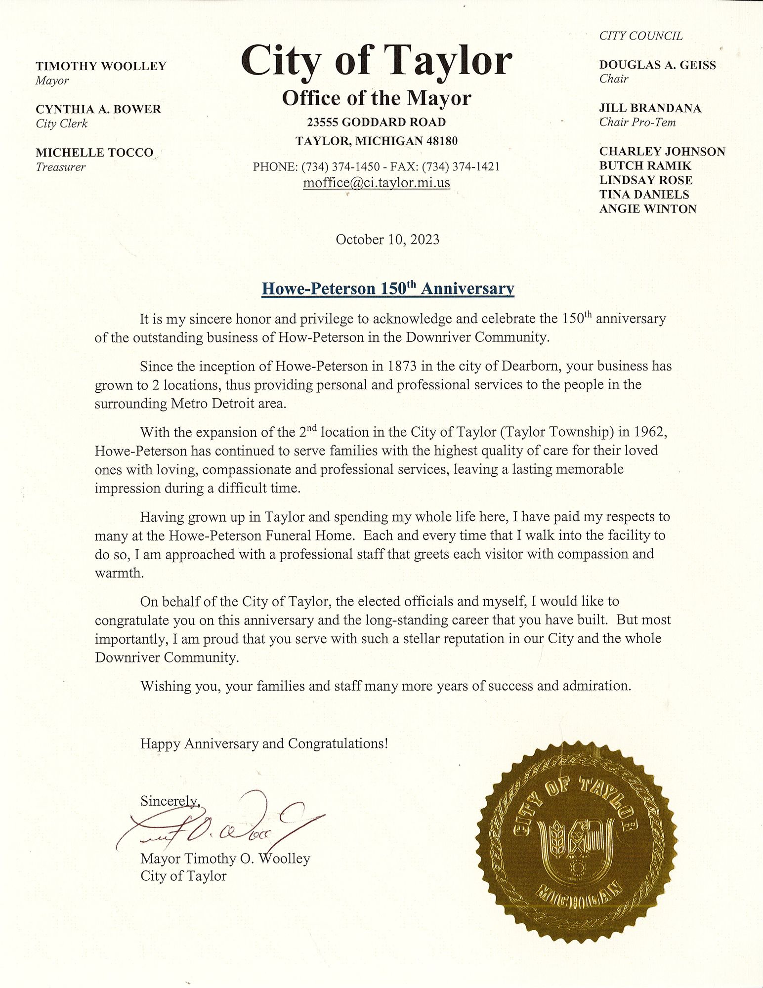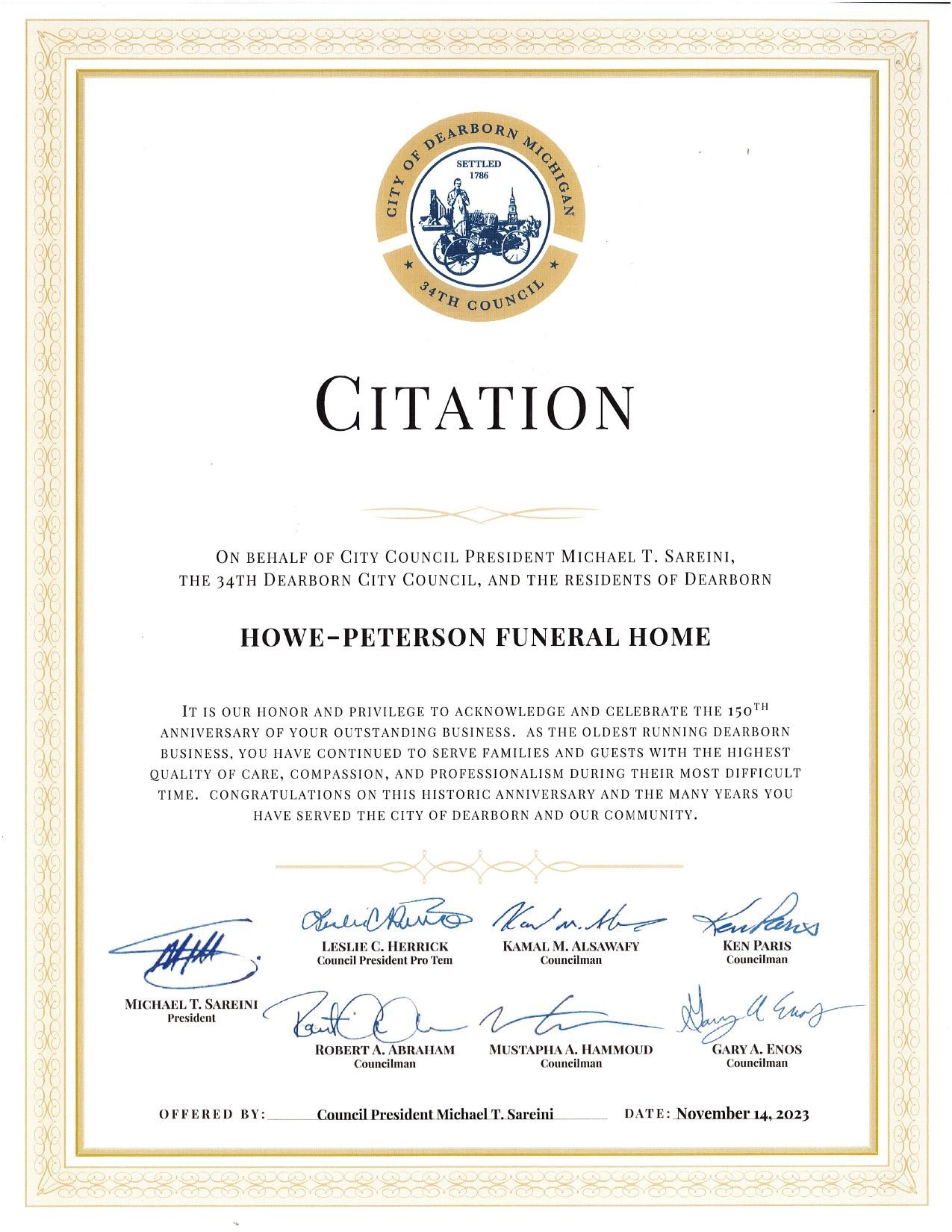 Citation from the City Council of Dearborn for our 150 year anniversary.